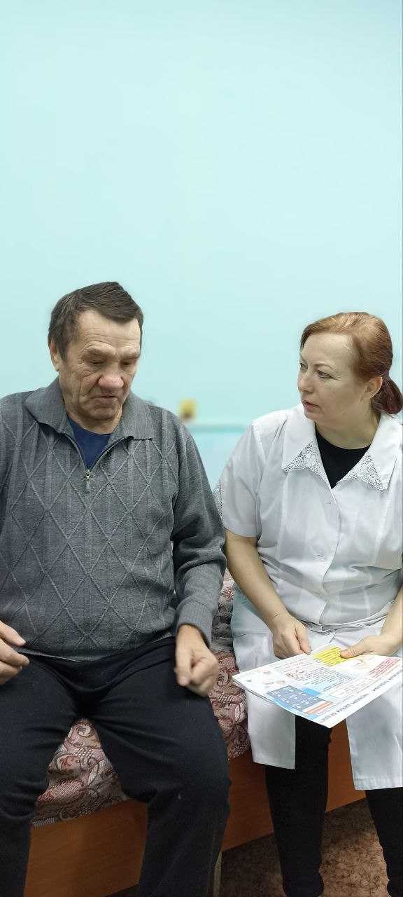 Проведена беседа с проживающими на тему «Диагностика переломов у пожилых людей». Почему чаще? • остеопороз; • падения из за нарушения координации; • замедленное восстановление. Где чаще? • шейка бедра; • предплечье; • лодыжки; • позвонки. Симптомы (могут быть стёртыми!): • боль при нагрузке; • ограничение движения; • слабый отёк; • небольшая деформация. Диагностика: 1. Осмотр врача. 2. Рентген (основной метод). 3. При необходимости — КТ, МРТ, денситометрия, анализы. Что делать при подозрении? 1. Не двигать пострадавшего. 2. Вызвать скорую. 3. При открытой ране — асептическая повязка. 4. Можно приложить холод (без раны). 5. Обезболивающее — только по согласованию с врачом. Нельзя: вправлять перелом или заставлять вставать. Профилактика: • диспансеризация (включая денситометрию); • кальций и витамин D (по назначению); • ЛФК; • безопасная обстановка дома; • удобная обувь. Важно: при любых подозрениях — сразу к врачу!