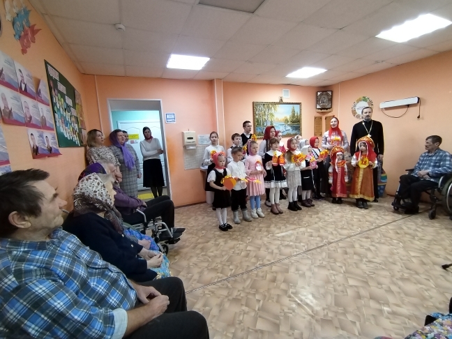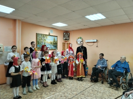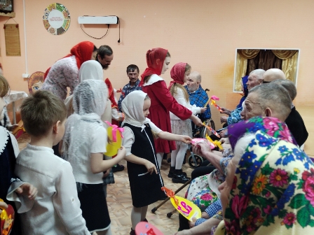 19 апреля воспитанники православного кружка «Зернышки» храма Пресвятой Живоначальной Троицы (р.п.Шаранга) посетили ГБУ «Шарангский дом-интернат» в с.Большая Рудка. Встреча прошла под руководством благочинного Шарангского округа иерея Антония Кочетова и матушки Дарии. Они пожелали проживающим дома-интерната обрести мир, любовь и радость общения друг с другом и с Богом. Ребята исполнили пасхальные песнопения, прочли поздравительные стихотворения и вручили проживающим пасхальные открытки. В завершение вручили воспитанникам кружка «Зернышки» сладкие подарки в честь Святого Христова Воскресения.